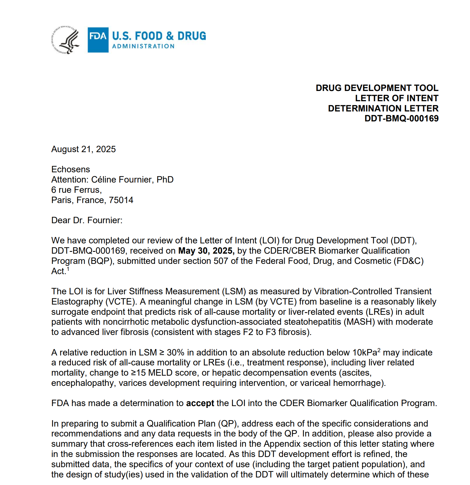 2025年8月,美國食品藥品監(jiān)督管理局(FDA)正式致函福瑞股份子公司Echosens,確認(rèn)接受其基于振動控制瞬時彈性成像(VCTE)技術(shù)測量的肝臟硬度值(LSM)作為代謝相關(guān)脂肪性肝炎(MASH)臨床試驗替代終點的意向書(LOI)。