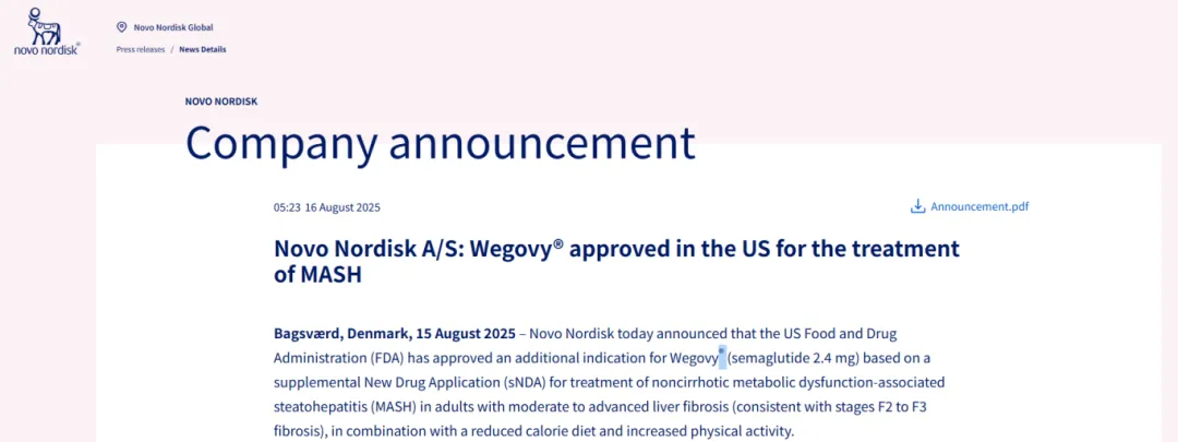 2025年8月15日,美國食品藥品監(jiān)督管理局(FDA)已批準(zhǔn)司美格魯肽Wegovy?(Semaglutide 2.4 mg)的補充新藥申請(sNDA),用于治療伴有中度至進展期纖維化(F2至F3期)的非肝硬化代謝相關(guān)脂肪性肝炎(MASH)成人患者用藥時需聯(lián)合低熱量飲食及增加體力活動。